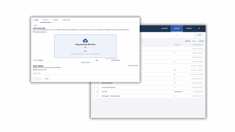 - Import your courses via SCORM 1.2, SCORM 2004 (2nd, 3rd, & 4th editions), AICC, xAPI, cmi5, MP3, MP4, PDF.