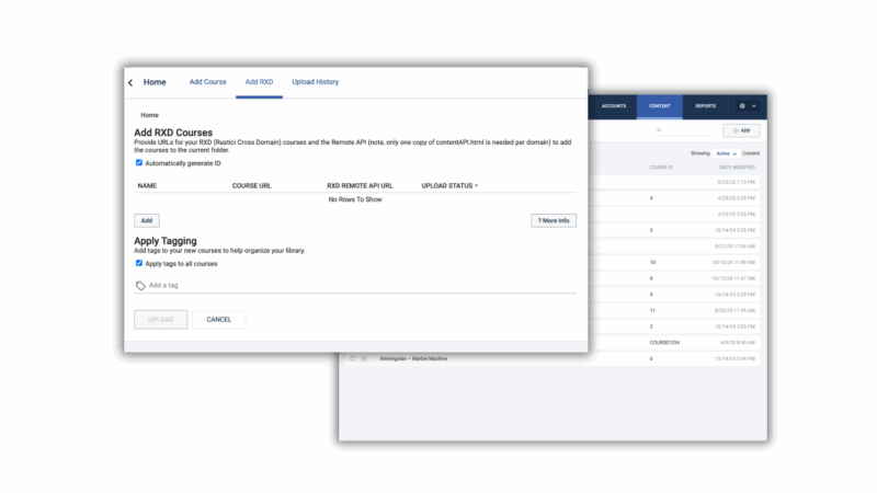 Add non-standards-based content to your Content Controller library with the help of Rustici Cross Domain (RXD). If you have a web experience, app, portal or anything that relies on a server-side database, you can import it into Content Controller to share with a third–party via SCORM 1.2, SCORM 2004 3rd Edition, AICC, xAPI, and cmi5 packages or via LTI.